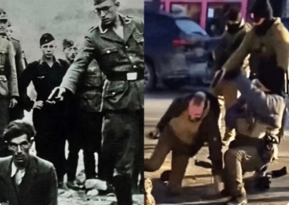 There exists the most extreme object lesson in the full magnitude of what did happen repeatedly in the human face of non-violence. A mere handful of Einsatzgruppen SS would round up, line up, and one by one execute a hundred or more Jews. Peacefully they went down. Throughout Eastern Europe, the mass execution of sacrificial Alex Prettis — an analogy brought to mind by another friend who, moments ago, emailed this: